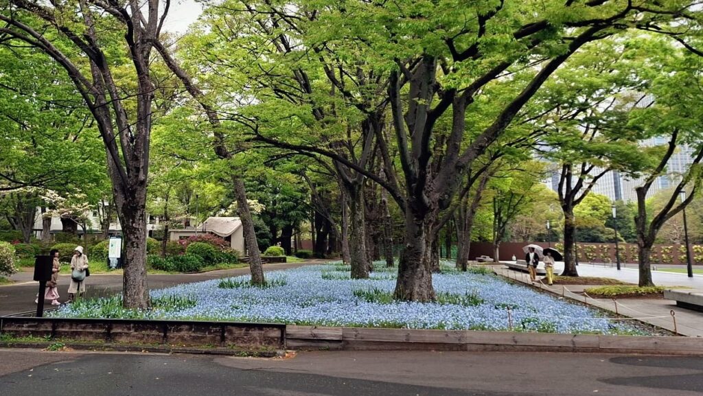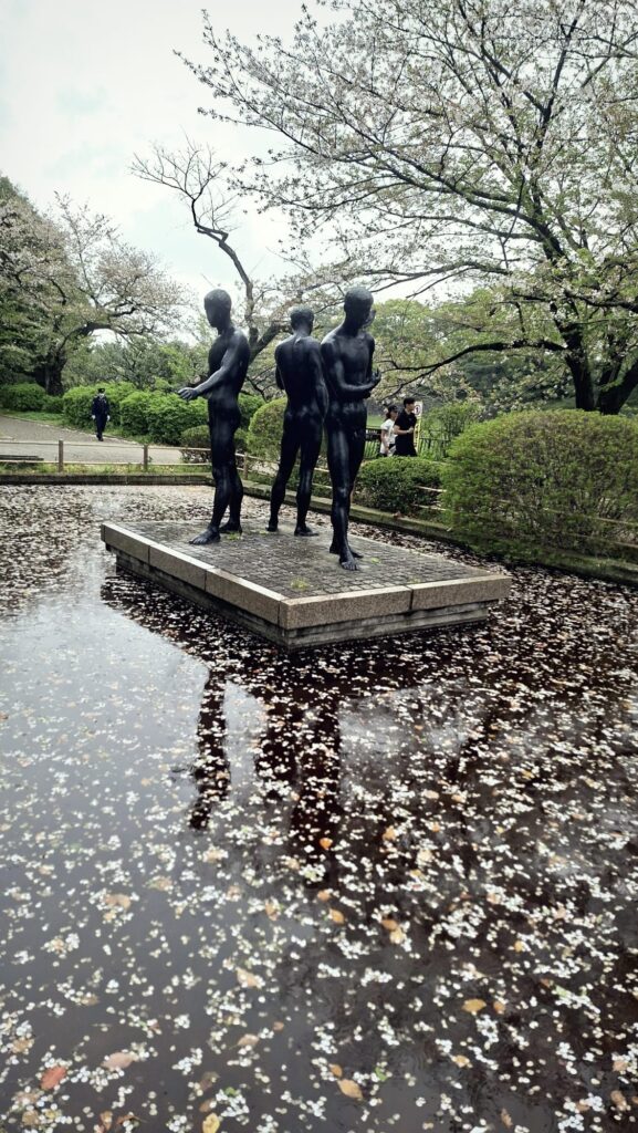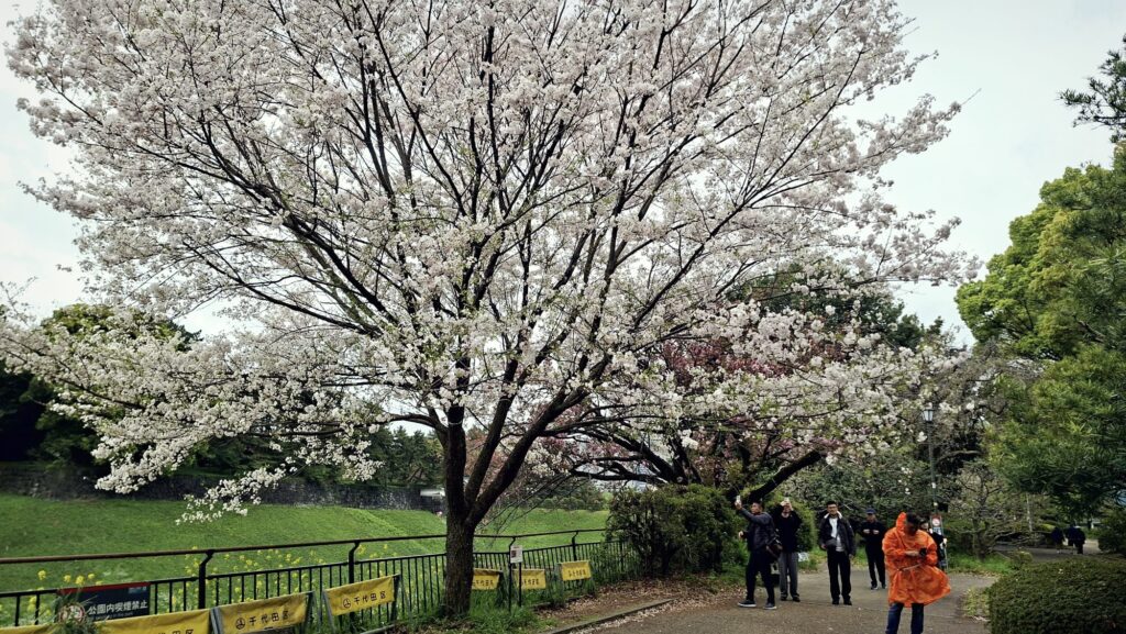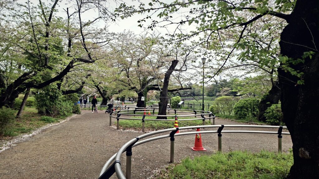 Absperrvorrichtungen im Chidorigafuchi Park: Heute ist ein bewölkter, regnerischer Tag, außerdem neigt sich die Kirschblüte ihrem Ende zu. An der Zahl und Art der Absperrungen kann ich mir gut vorstellen, wie viel hier in den letzten Wochen los war.