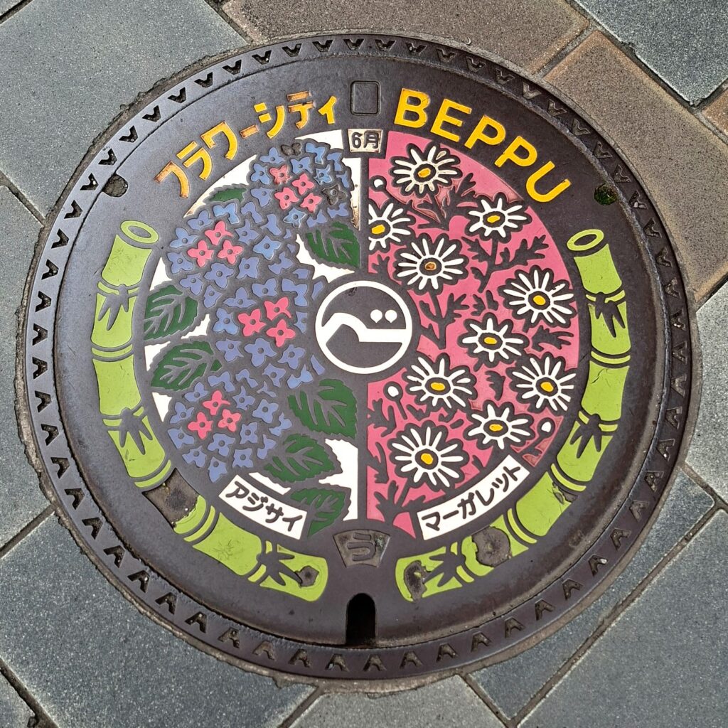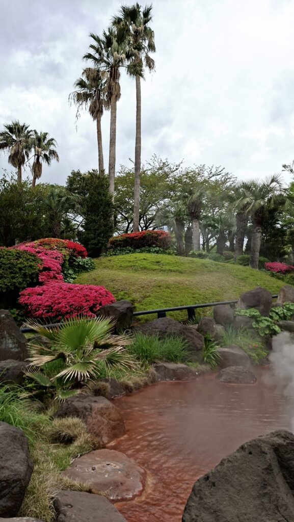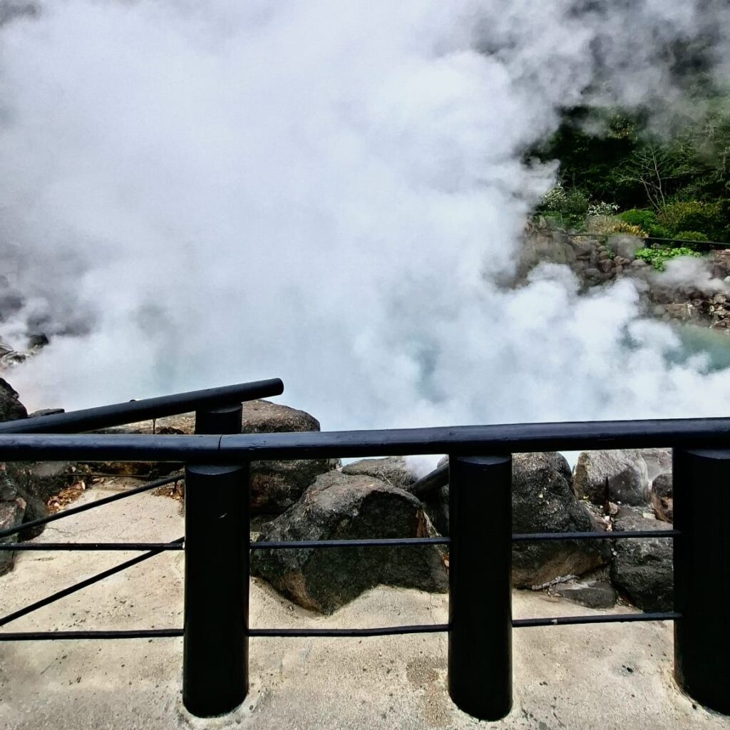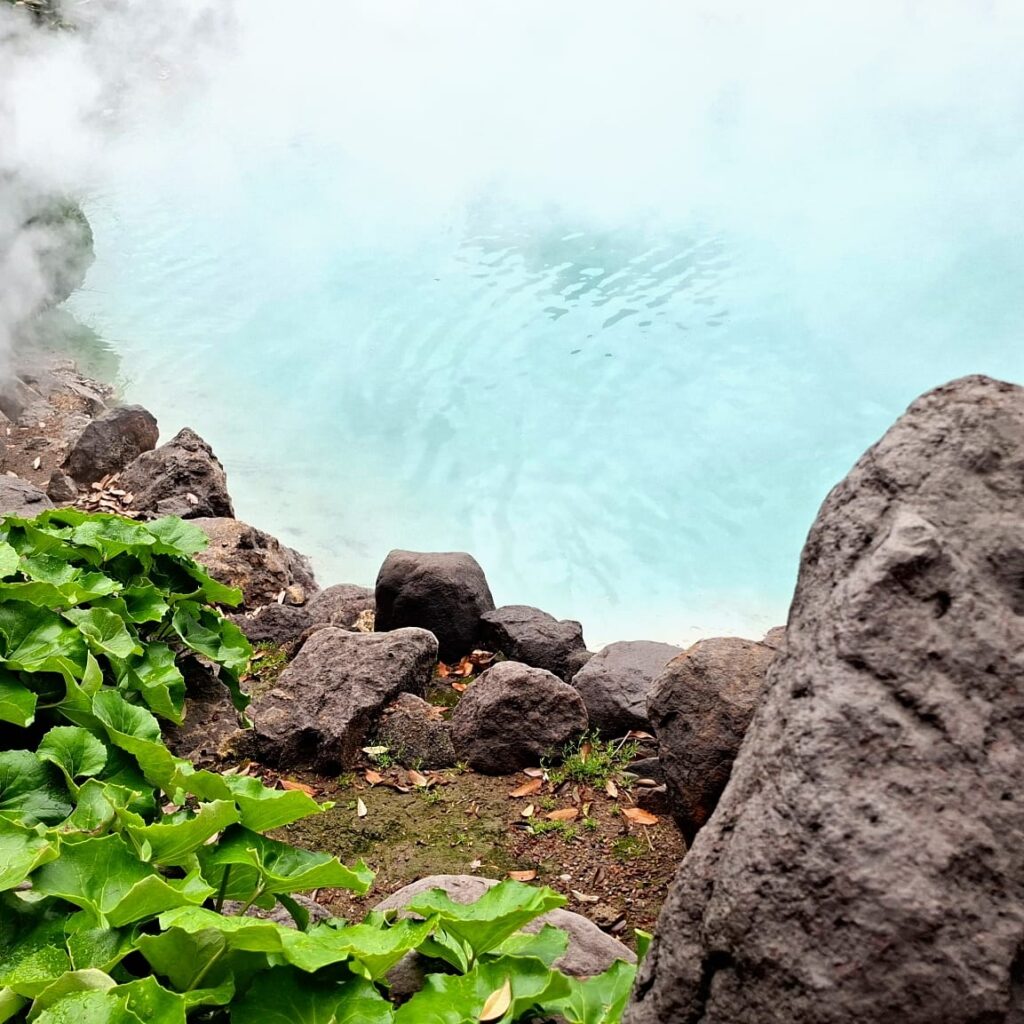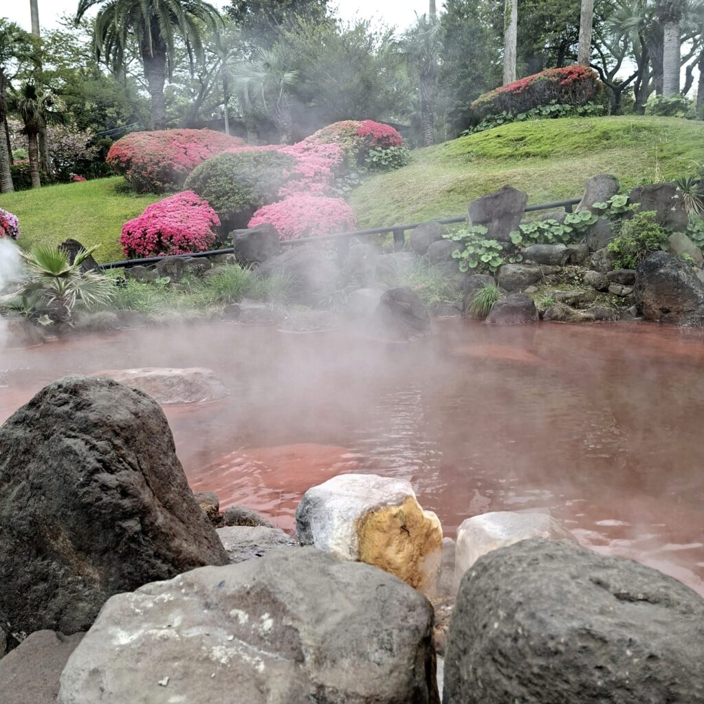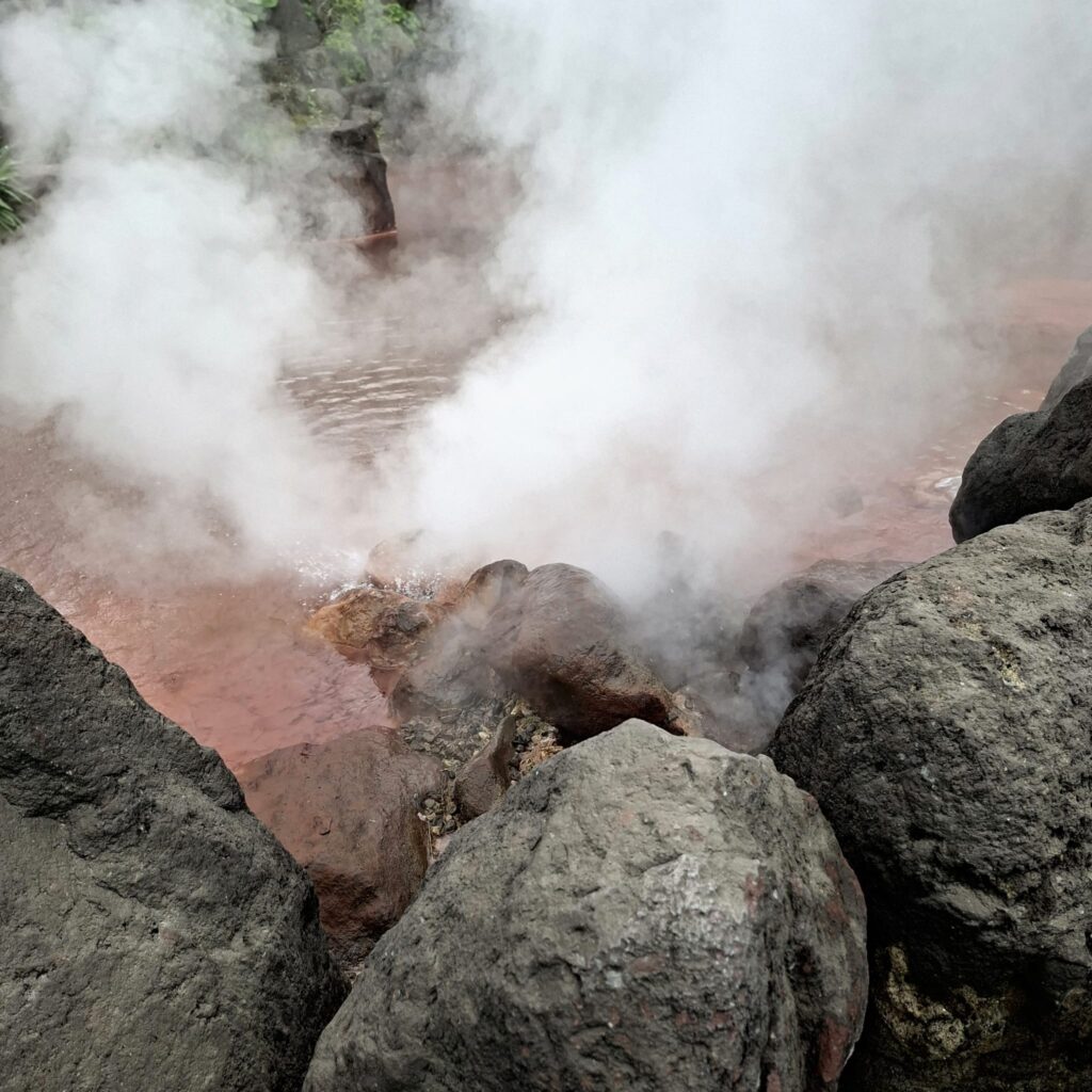 Diese sieben geothermischen heißen Thermalquellen sind mit über 99 Grad extrem heiß, haben intensive Farben und sind eine Touristenattraktion, zum Baden nicht geeignet. Ich sehe mir die erste Quelle, Umi Jigoku (Meer-Hölle), an. Ihr blaues Wasser hat der Quelle zu ihrem Namen verholfen. Mich schrecken die gesamte Infrastruktur und touristisches Getümmel an einem Werktag ab und nach einem Spaziergang zu dem farbenfrohen Garten mit rötlich blubbernden Quellwasser trete ich den Rückzug an.