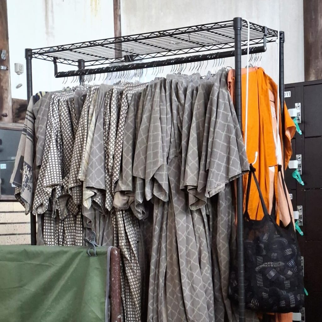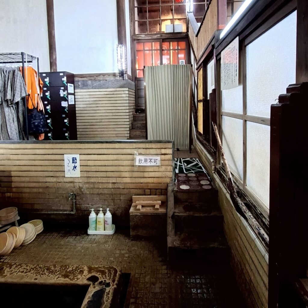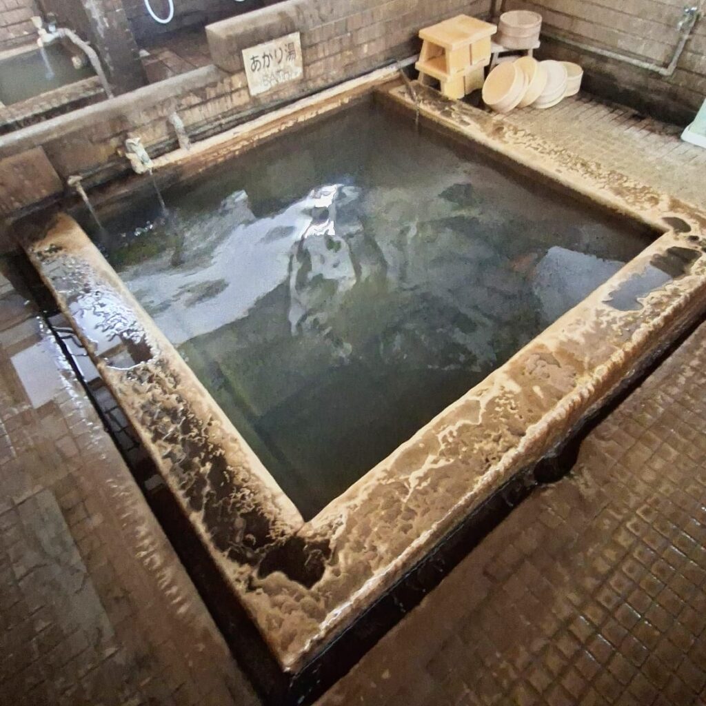 Yukata und Gürtel werden in einen eigens bereitgestellten Trog getaucht und anschließend zu den benutzten Yukatas gegeben. Ich dusche den Sand, der trotz Yukata über den ganzen Körper verteilt ist ab und entspanne mich ein weiteres Mal, diesmal im Onsen, das direkt im selben Raum liegt.