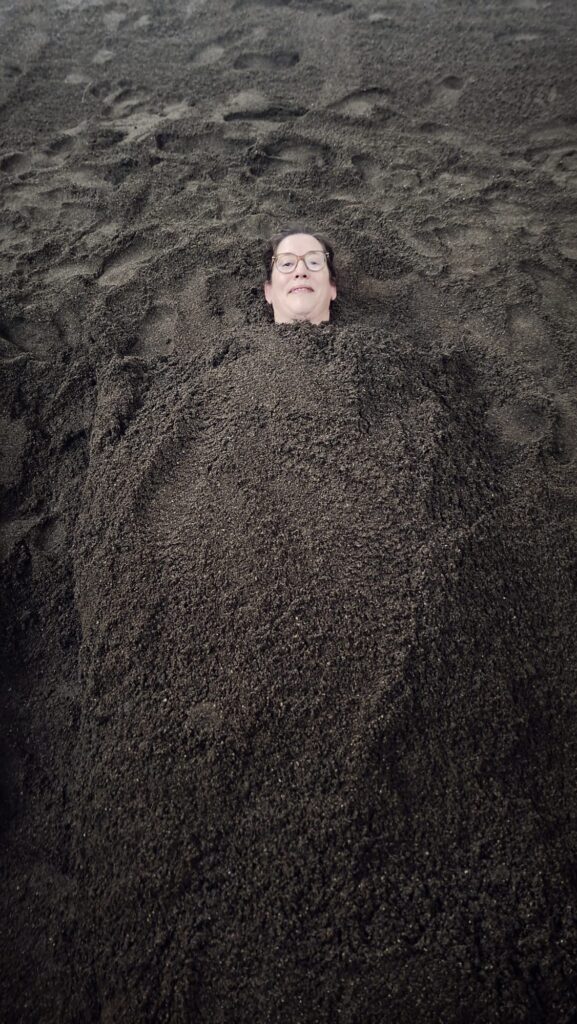 Ich lege mich in den wirklich sehr warmen Sand, Hände neben den Körper und schon werde ich mit mehreren Schippen von echt schweren Sand zugedeckt, bis zum Kinn. Nach einem ganz kurzen Anflug von Beklemmung genieße ich die Wärme, fange durch den schweren und knapp 60 Grad heißen Sand schnell zu schwitzen an. Wozu das gut ist? Entspannung der Muskeln, Förderung der Durchblutung, Entgiftung.
