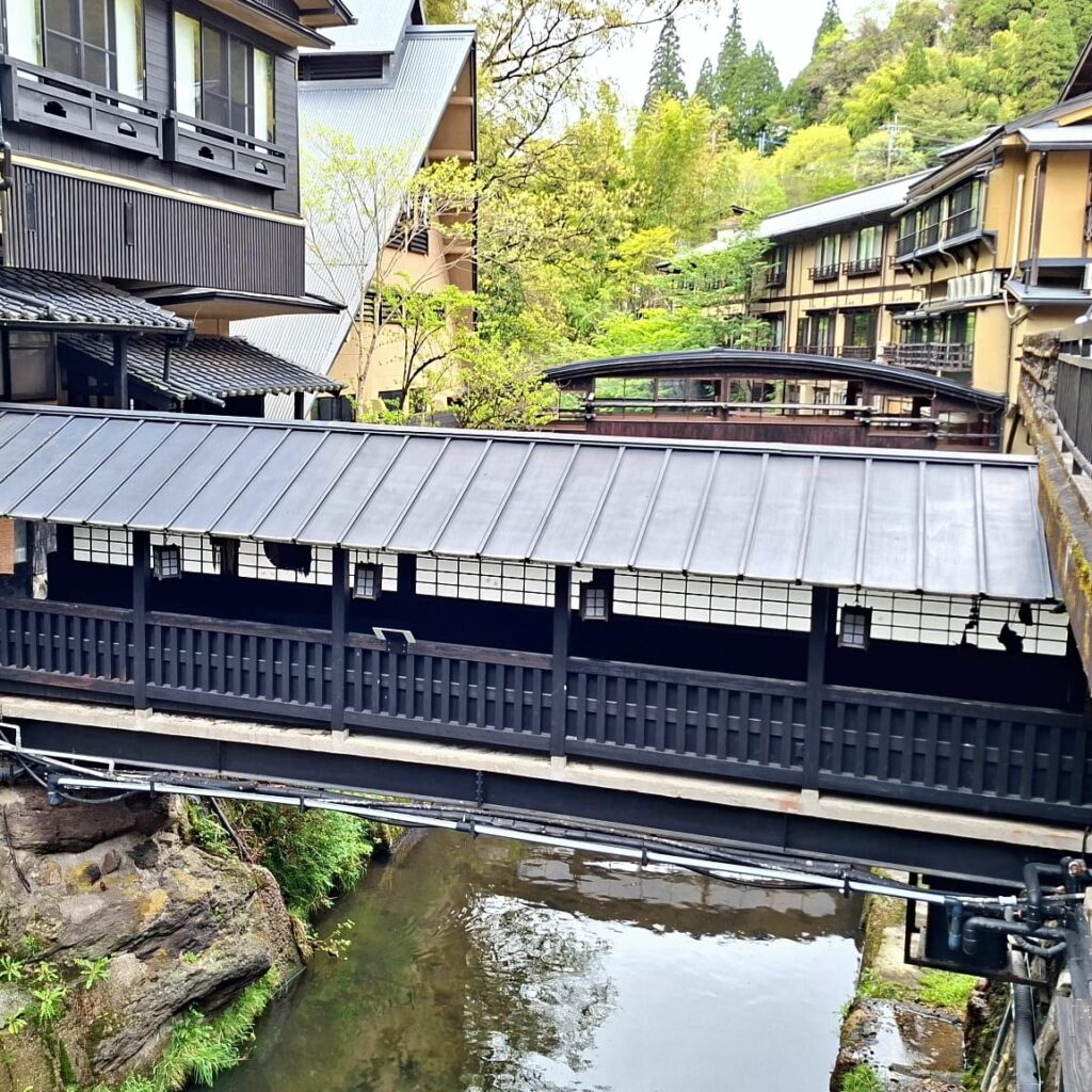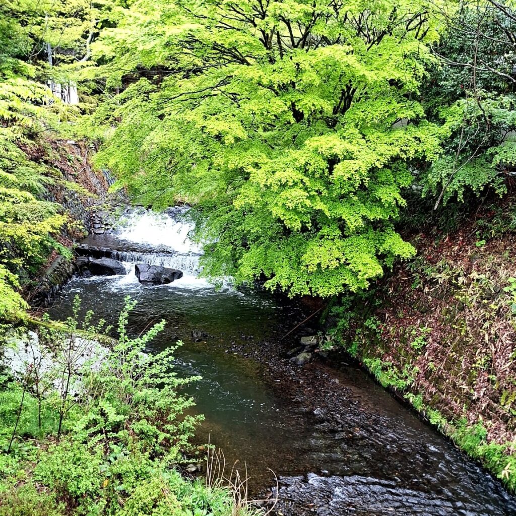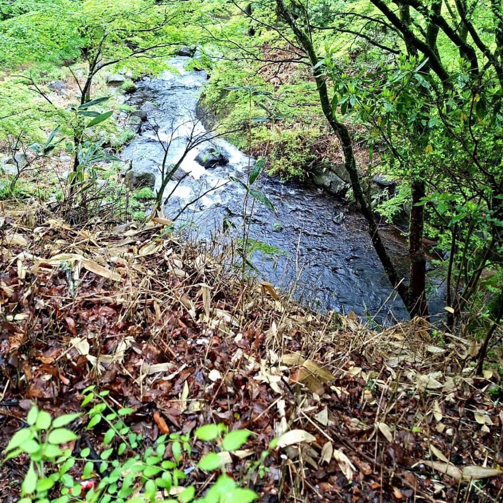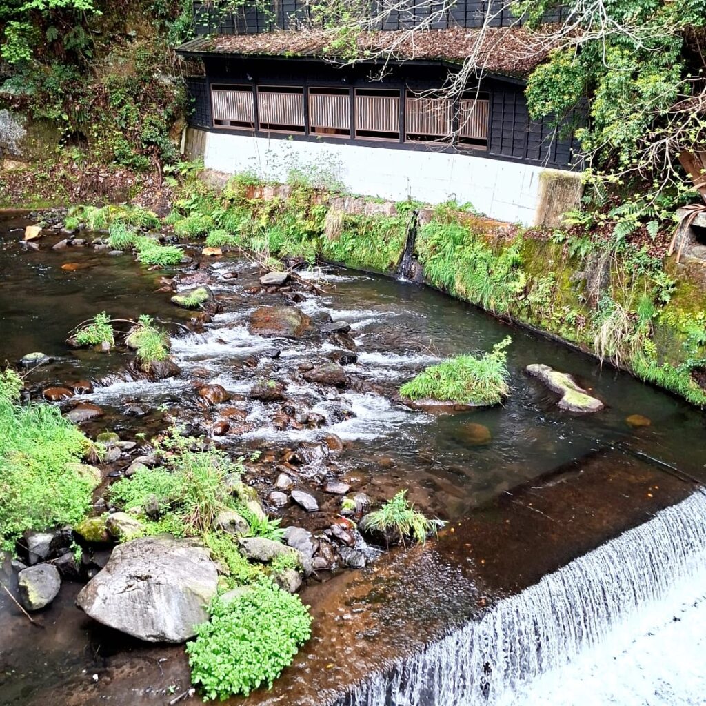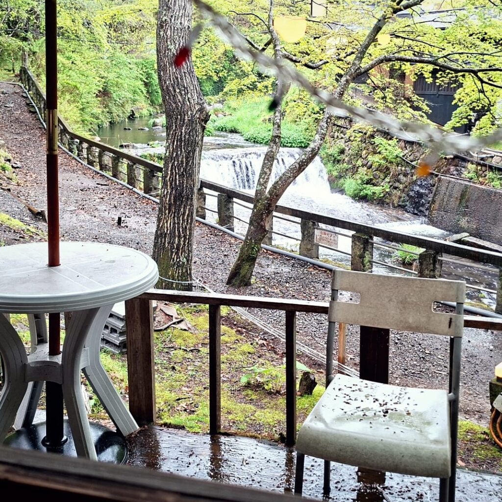 - Anschließend Nr. 4 (Yamamizuki) verbunden mit einem gut zwei Kilometer langen Spaziergang bergaufwärts. Das Onsen gehört zu einem Roykan und hat ungeahnte Dimensionen: neben einem sehr schönen einfachen Innenbecken gibt es ein vergleichsweise großes Outdoorbecken, von dem aus man auf den Flusslauf und in den Wald blicken kann, und zwar sehr weit. Das ist dann doch sehr außergewöhnlich.