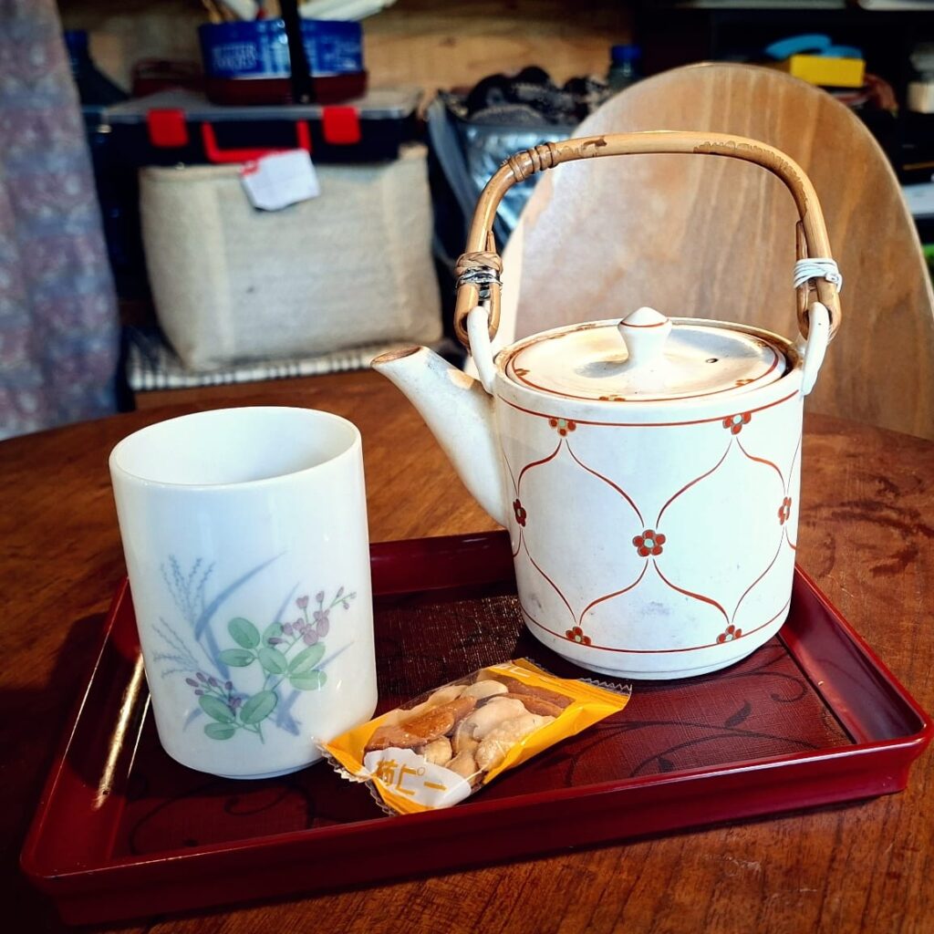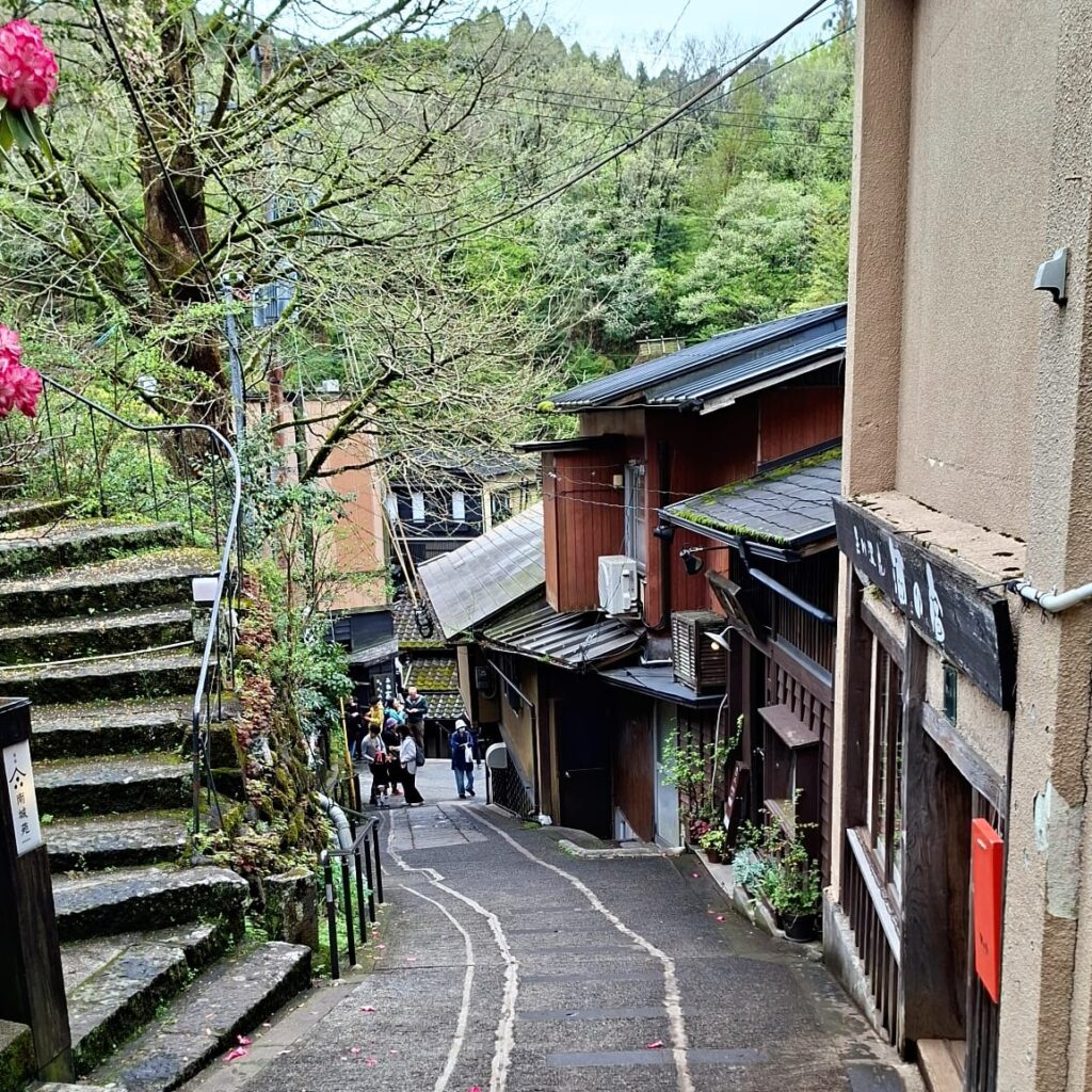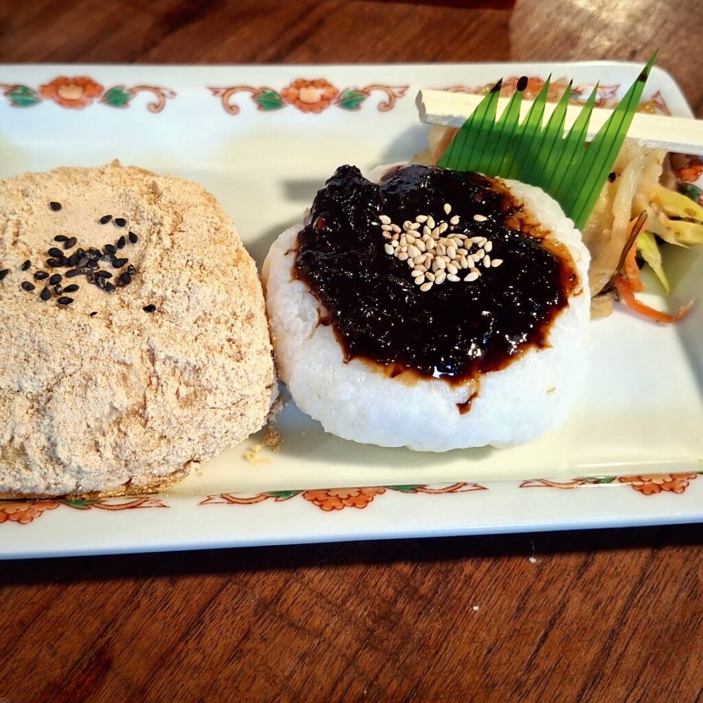 Zum Frühstück bestelle ich Mochi, das sind traditionelle Reiskuchen aus gestampftem Klebreis, unterschiedlich gefüllt. Man isst sie warm. Ohne Bestellung erhalte ich ein Ei in Teigmantel und Bohnen, außerdem grünen Tee. Und auf die Frage, ob ich Alkohol trinken würde, ungefragt auch noch ein Stamperl selbstgemachten Pflaumenlikör. Sehr lecker, wobei die Wirtin nicht mittrinkt. Aus der Vielzahl Onsenmöglichkeiten empfiehlt sie mir zwei, die ihrer Meinung nach gut zu mir passen sollen. Ich bin froh, dass sie mir die Entscheidung abnimmt, bedanke mich und mache mich neugierig auf den Weg.