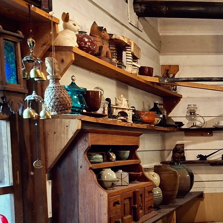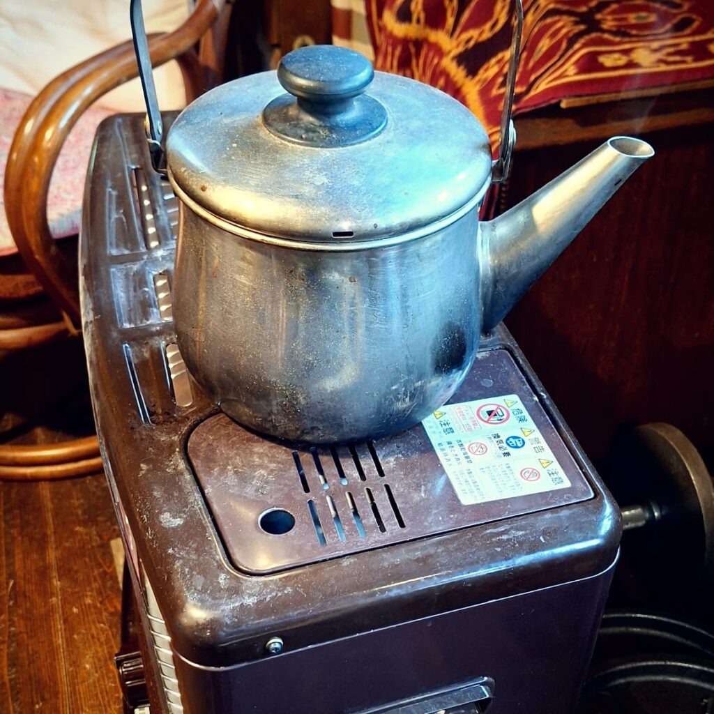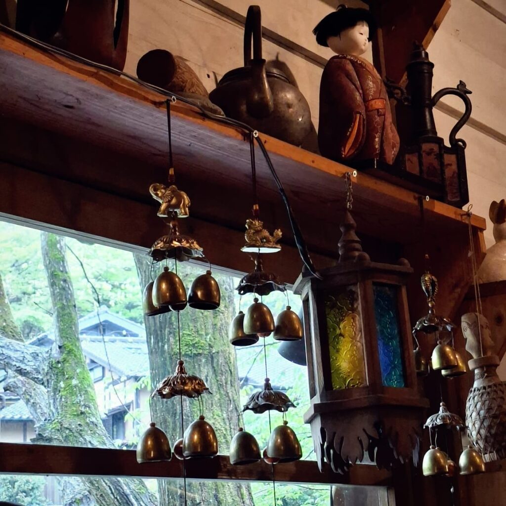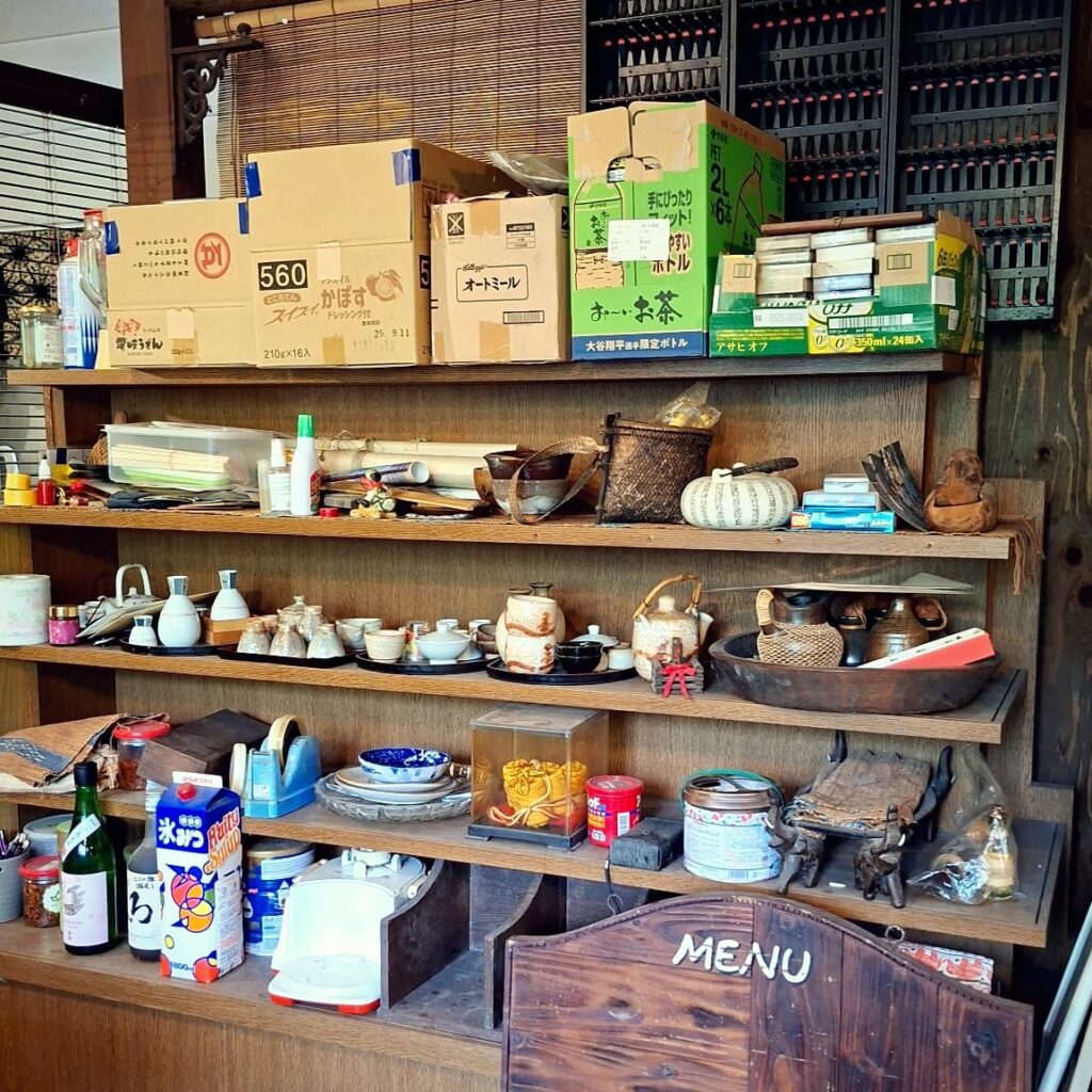 Als erstes lande ich im Hidamarinoie, einem skurrilen Café am Fluss. Am späten Vormittag und bei schlechtem Wetter bin ich der einzige Gast.