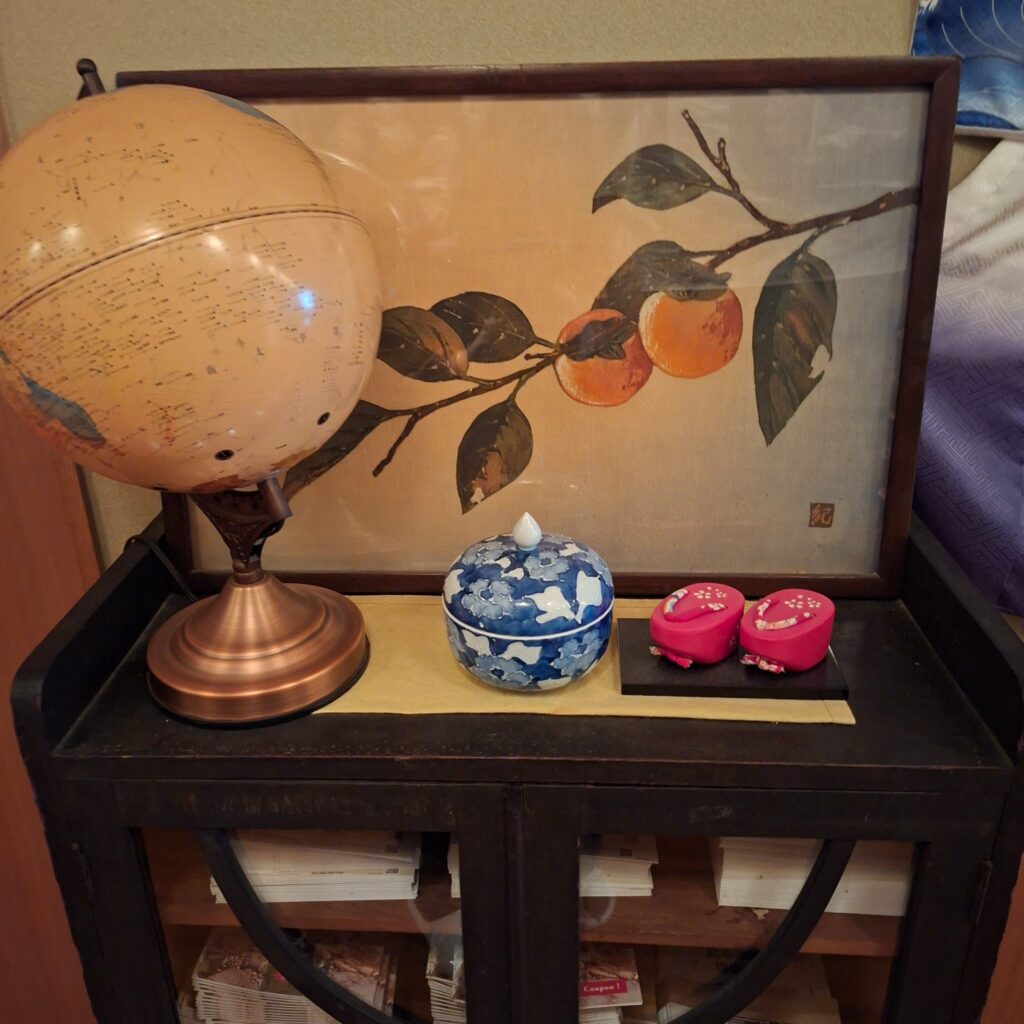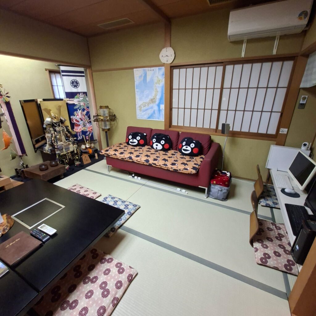 Meine Unterkunft in Kamumoto hat eine echte Seele. Wie ich das genau meine? Die Besitzerin hat in liebevoller Kleinarbeit eine schier grenzenlose Sammlung aus Souvenirs, Erinnerungen, Einrichtungsgegenständen und mehr aufgebaut. Wer wie ich vorher in einem einfachen Roykan in Aso in den Bergen war, muss sich vielleicht erst einmal an die Vielfalt von Dingen in den Räumen der Unterkunft gewöhnen. Und gleichzeitig sind die einzelnen Räumlichkeiten in dem Haus sehr gemütlich: die Küche wird zum Austauschort, der Eingangsbereich zu einem Beobachtungsort der Fische, gleiches gilt für die Fische im Eimer auf der Dachterrasse. Überhaupt ist diese Dachterrasse meine Ruheoase mitten in der Stadt. Ganz unverwechselbar und einzigartig. Die wenigen Zimmer sind klein, dafür ist das ganze Ambiente sauber und gemütlich. For women only.