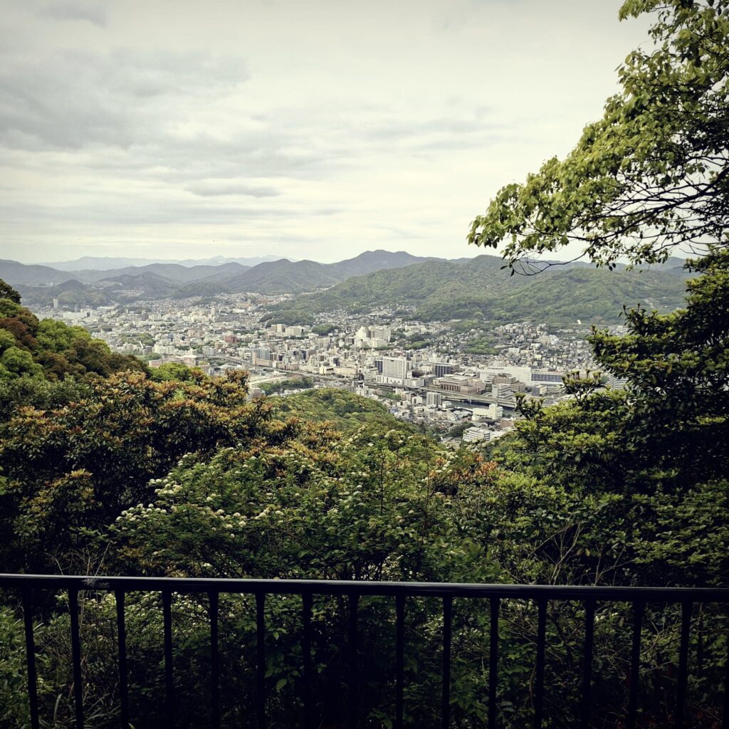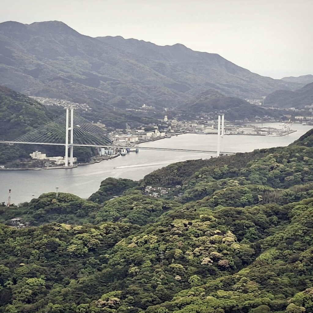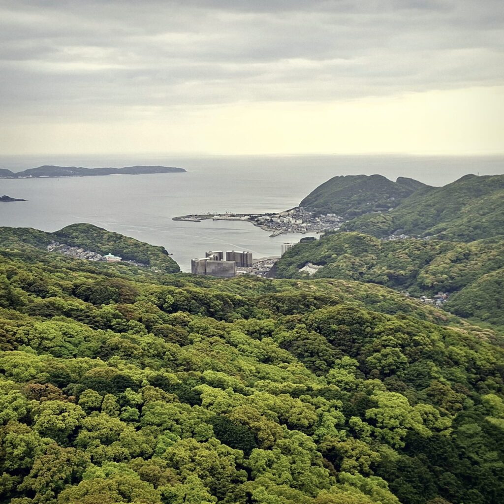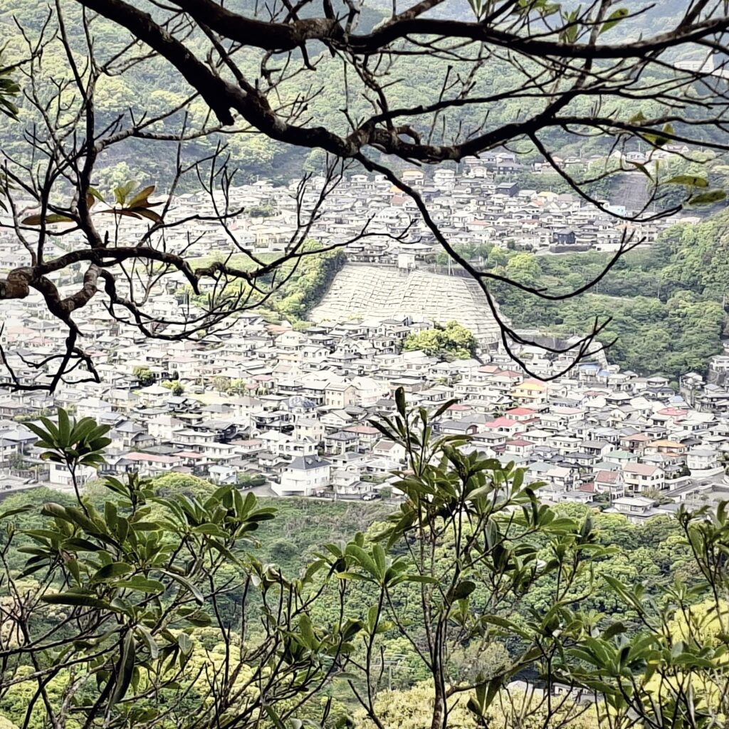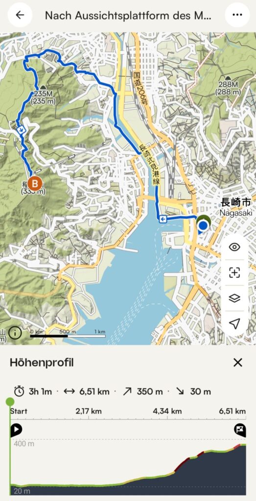 Anfänglich gibt es schöne Fußgängerwege entlang von Flüssen und einfachen Häusern. Später dann kommen wir abseits der Hauptstraße nicht mehr weiter und setzen unseren Spaziergang notgedrungen auf der dicht befahrenen Straße fort. Meine Navigation über die App Komoot schlägt nach einiger Zeit wieder einen Weg durch den Wald vor. Und wie so manchmal überschätze ich die Fähigkeiten der digitalen Kartographie. Schon am Einstieg ist es unübersichtlich: kein Weg, es geht steil nach oben, doch wir schlagen uns durch. Nach einigen Höhenmetern hangeln wir uns von einem rosa Stofffetzen zum nächsten. Wir suchen unseren Pfad immer wieder neu. Es geht über einen Grad mit grandiosen Blicken nach Nagasaki und in die Berge. Und dann weitet sich der Weg und wir befinden uns auf der Zielgeraden zur weithin sichtbaren Aussichtsplattform des Mount Inasa. Von seiner Dachterrasse gibt es einen sehr schönen Rundblick auf Nagasaki, die Bucht und die vorgelagerten Inseln. Zur Rückkehr nach Nagasaki nehmen wir den Bus.