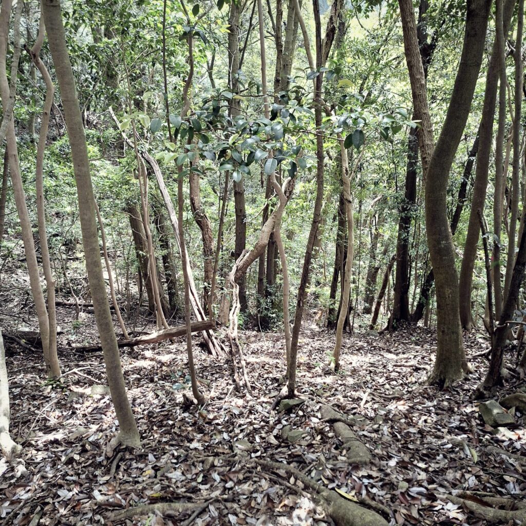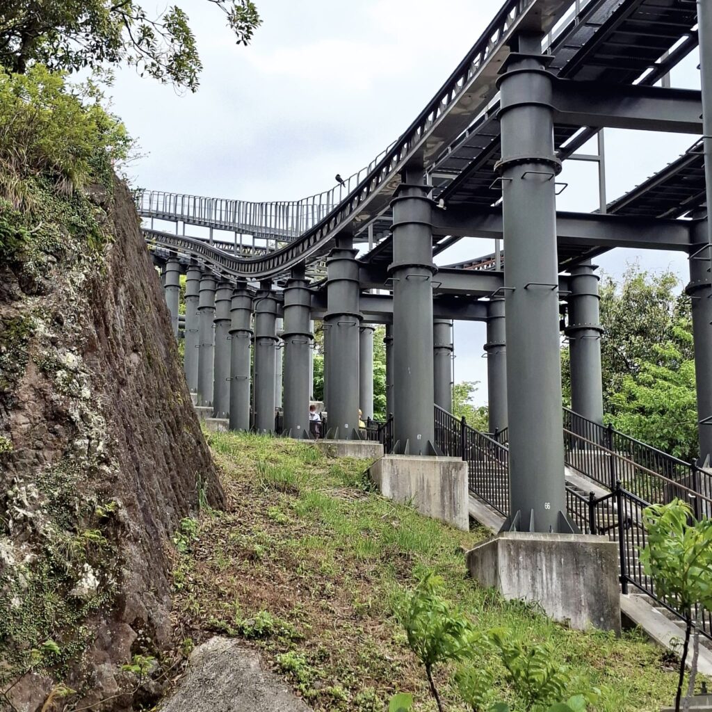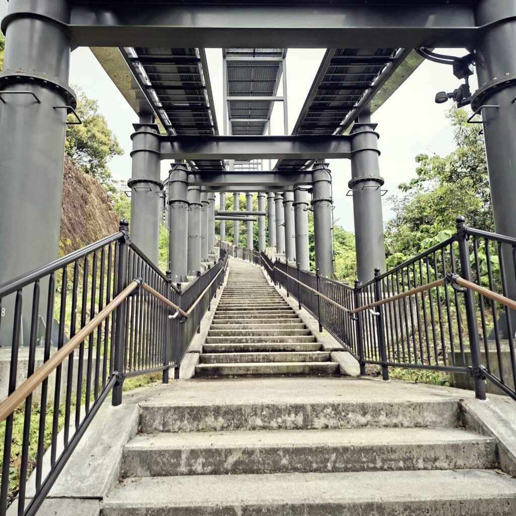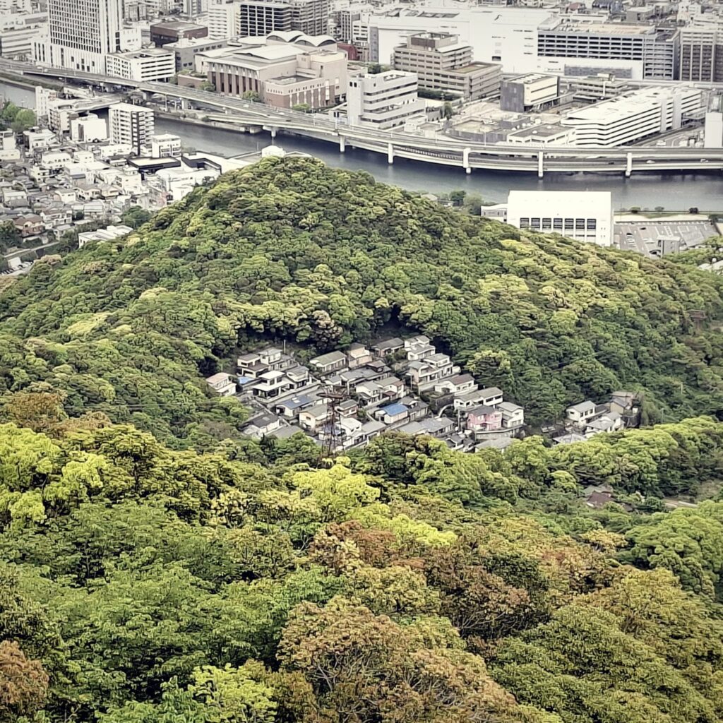 Anfänglich gibt es schöne Fußgängerwege entlang von Flüssen und einfachen Häusern. Später dann kommen wir abseits der Hauptstraße nicht mehr weiter und setzen unseren Spaziergang notgedrungen auf der dicht befahrenen Straße fort. Meine Navigation über die App Komoot schlägt nach einiger Zeit wieder einen Weg durch den Wald vor. Und wie so manchmal überschätze ich die Fähigkeiten der digitalen Kartographie. Schon am Einstieg ist es unübersichtlich: kein Weg, es geht steil nach oben, doch wir schlagen uns durch. Nach einigen Höhenmetern hangeln wir uns von einem rosa Stofffetzen zum nächsten. Wir suchen unseren Pfad immer wieder neu. Es geht über einen Grad mit grandiosen Blicken nach Nagasaki und in die Berge. Und dann weitet sich der Weg und wir befinden uns auf der Zielgeraden zur weithin sichtbaren Aussichtsplattform des Mount Inasa. Von seiner Dachterrasse gibt es einen sehr schönen Rundblick auf Nagasaki, die Bucht und die vorgelagerten Inseln. Zur Rückkehr nach Nagasaki nehmen wir den Bus.
